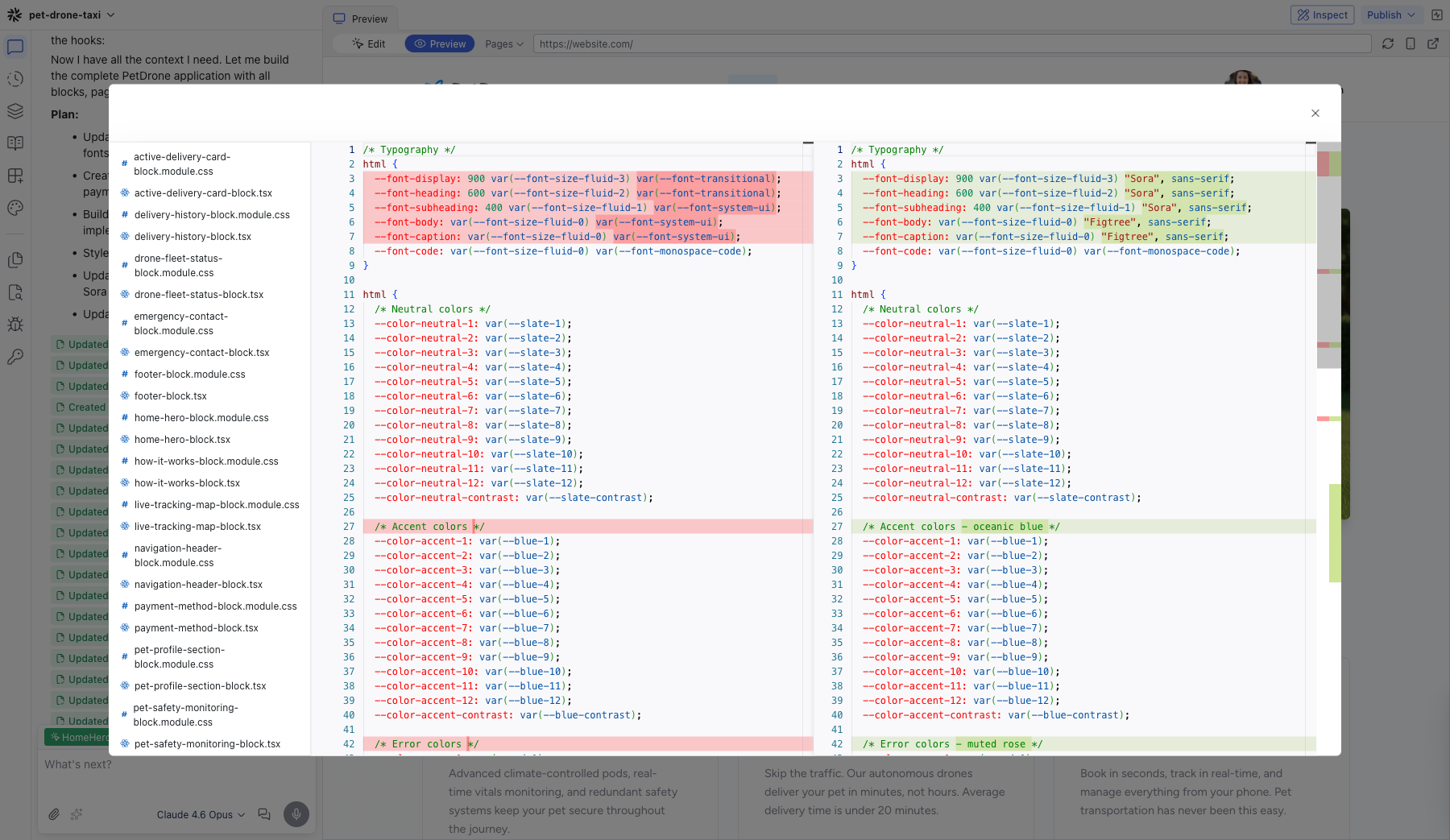 Seeing diffs for visual edits is particularly useful — when you drag an element or change a color, you can verify exactly what CSS was modified.