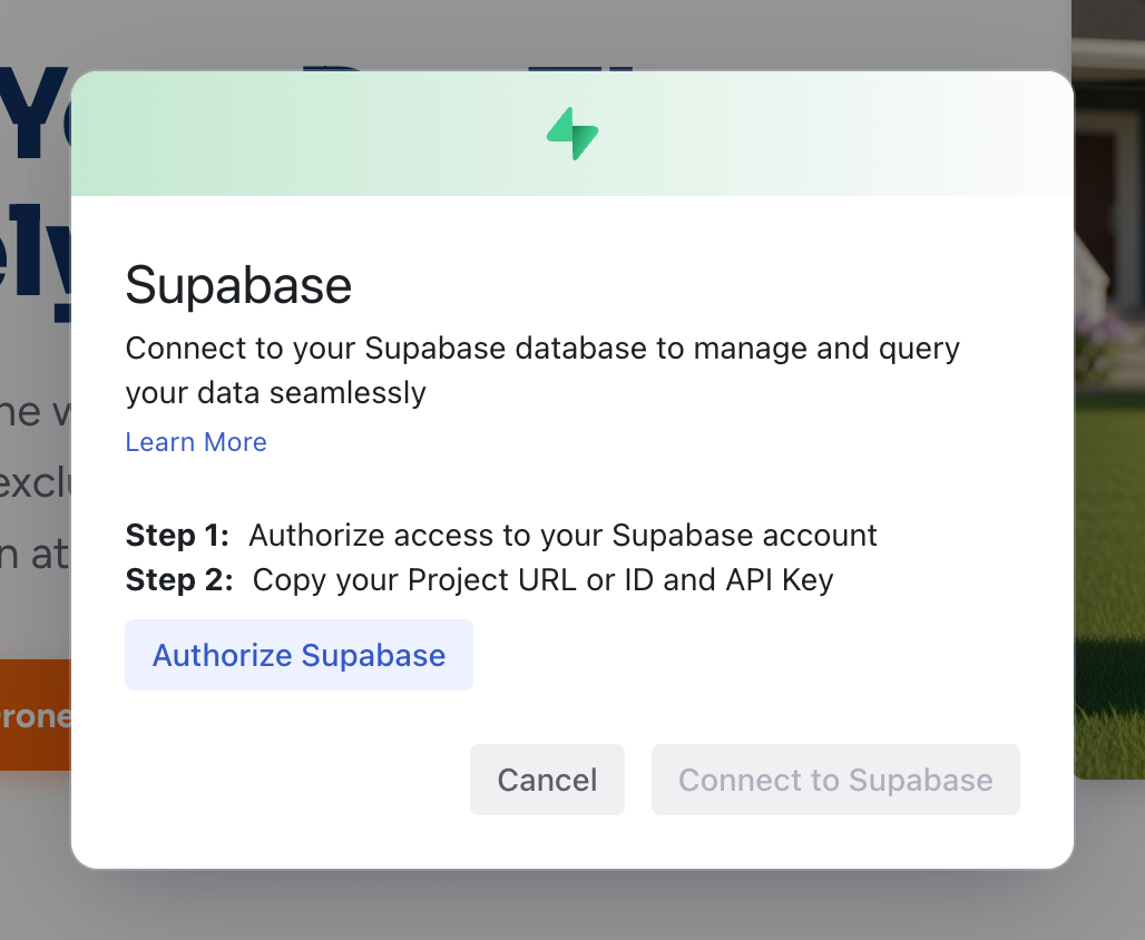 Once connected, the AI can create database-backed features, authentication flows, and data-driven pages. You can also create a new Supabase project directly from Dazl after connecting your account.