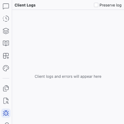 The Logs panel shows runtime output from your project's client and server, helping you identify and troubleshoot errors.