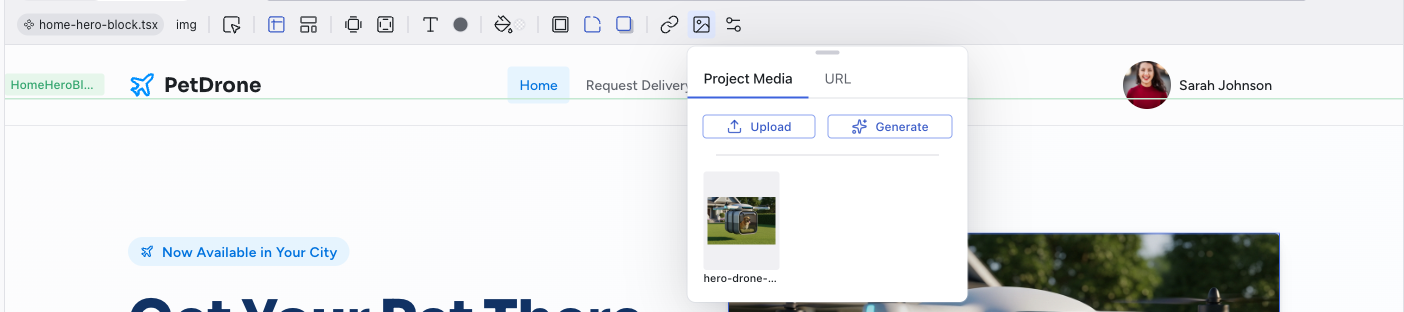 The Media panel is part of the Editing Toolbar and opens when you select an image element (or double-click one). It lets you browse, replace, upload, and generate images for your project.