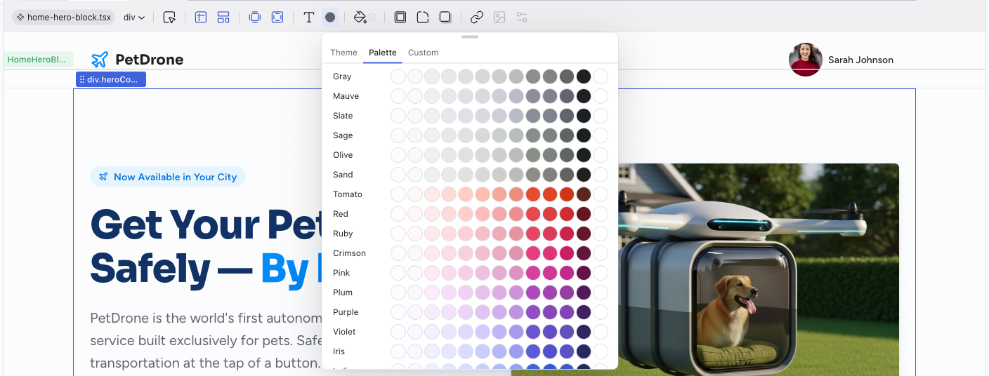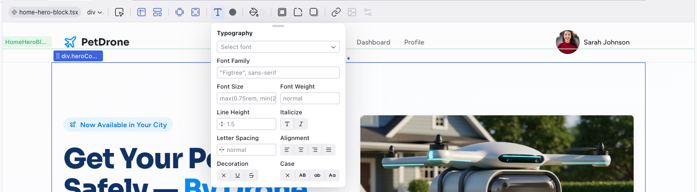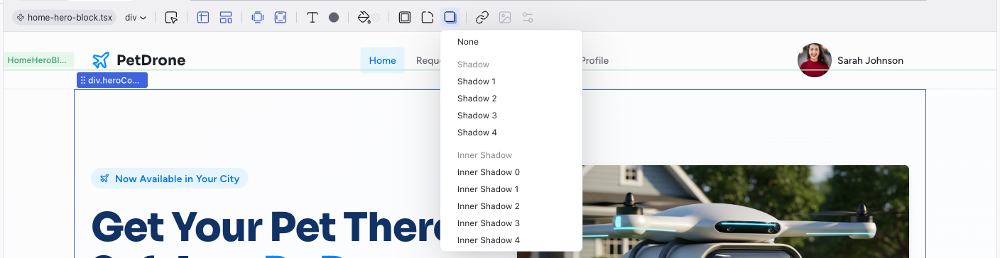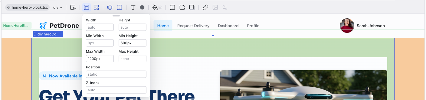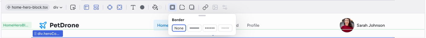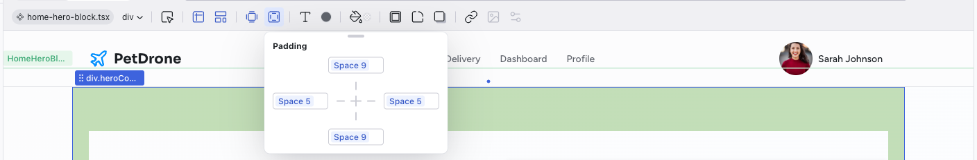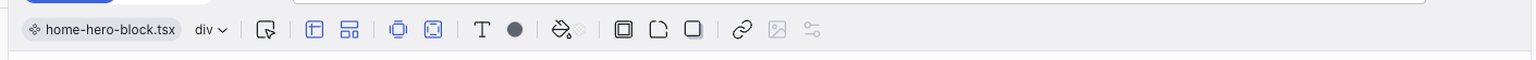 The left side of the toolbar shows the file breadcrumb (e.g., home.tsx) and the component name (e.g., HomeHeroBlock). This tells you exactly which file and component the selected element belongs to.