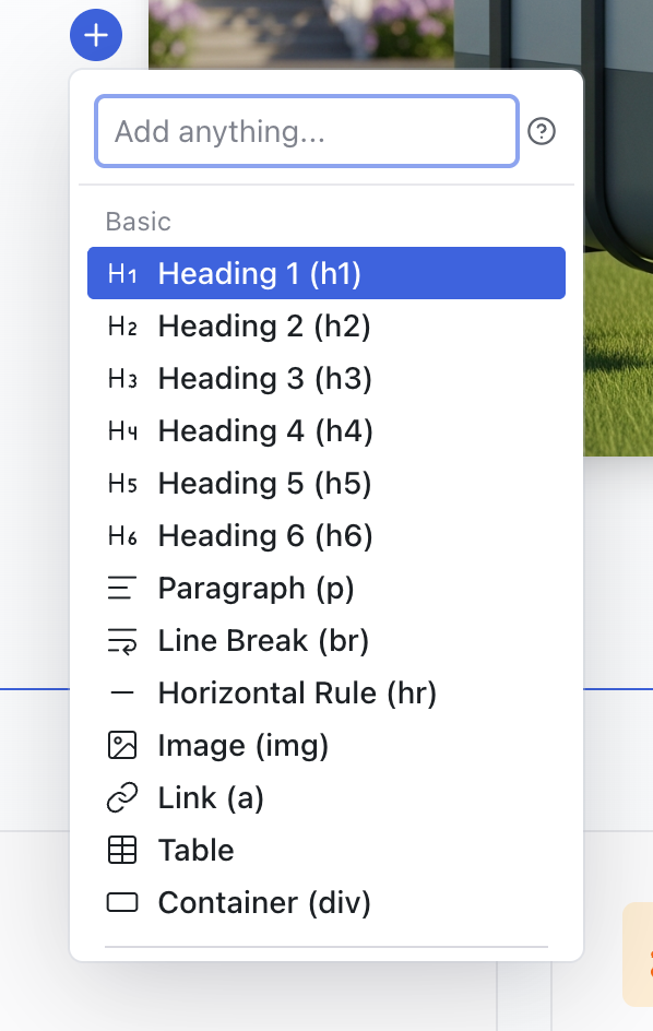 When you select a component, quick insert buttons appear above and below it on the stage. Click one to open the element picker, where you can search or browse categorized HTML elements (headings, images, forms, containers, and more). The AI generates the chosen component based on the surrounding context and inserts it at that position.