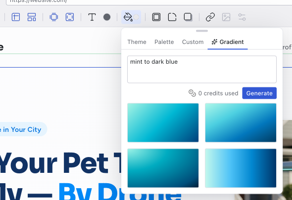 - Gradient — describe a gradient in natural language (e.g., "mint to dark blue", "warm sunrise", "vibrant pattern") and the AI generates it. This uses credits.