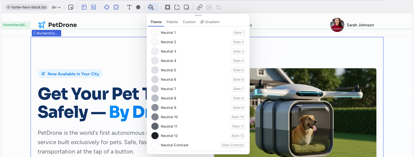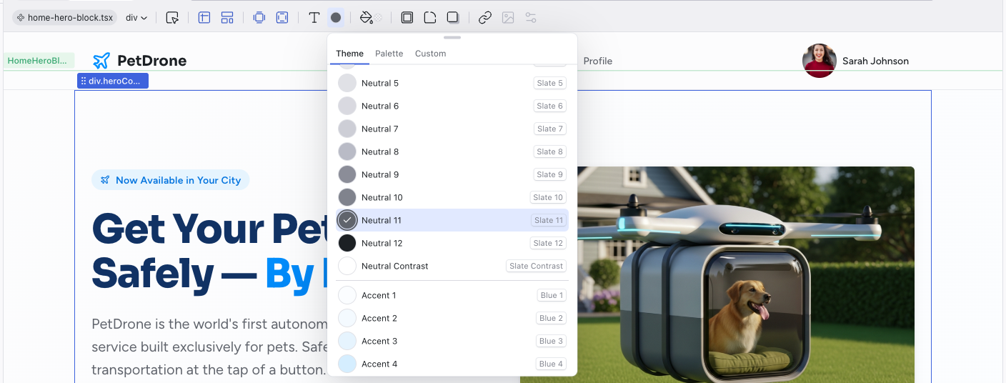 - Theme — your project's semantic design tokens, organized by group (Neutral, Accent, Error, Success, Warm, Warning). Each group shows 12 graded colors plus a 13th Contrast swatch — a white or black that looks good against the group's colors. The current color is indicated with a checkmark. Using token colors keeps your project visually consistent and responsive to theme changes.