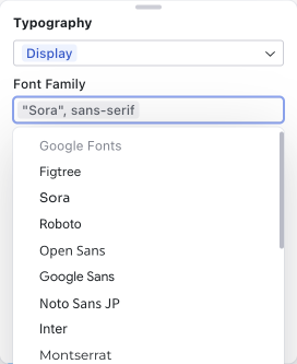- Font Family — the CSS font-family value. The dropdown includes Google Fonts (Figtree, Sora, Roboto, Inter, Montserrat, and many more) alongside your theme's generic font stacks, so you can browse and apply web fonts directly.