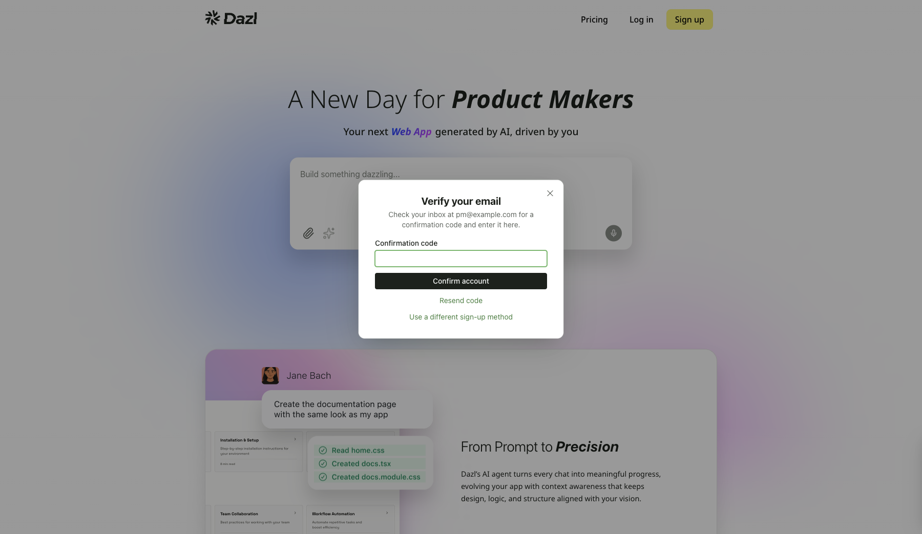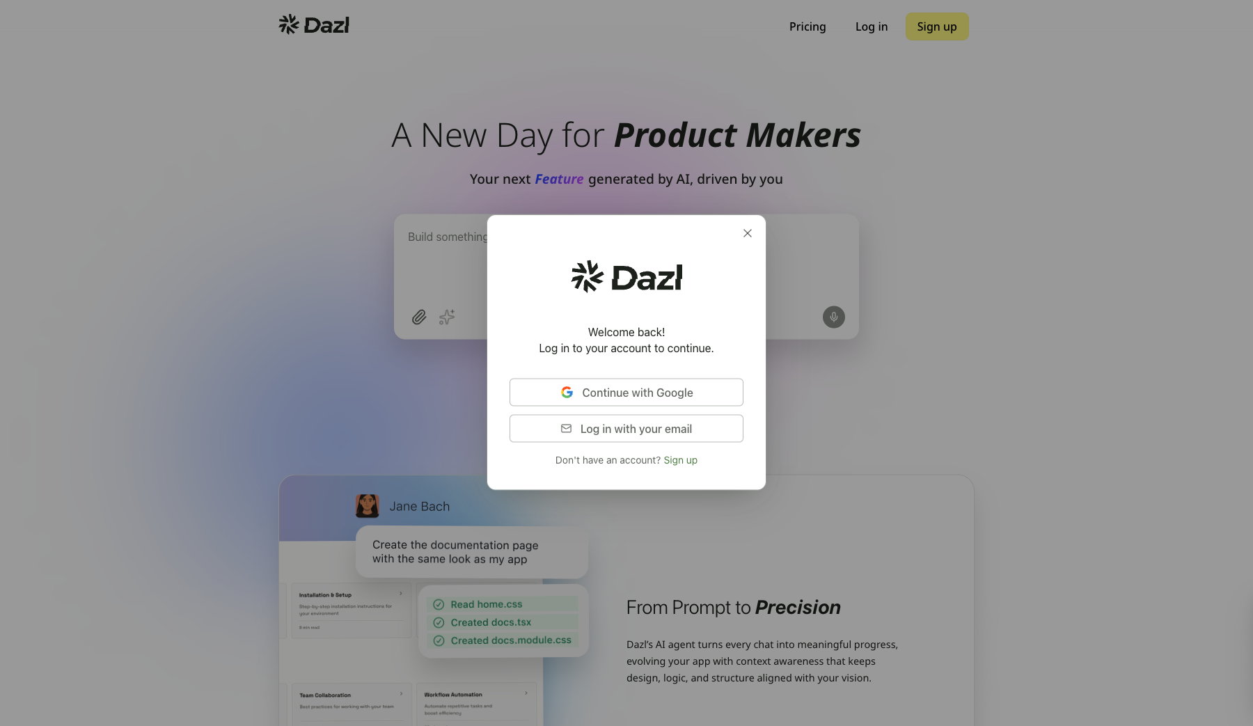 If you already have an account, click Log in on dazl.dev and choose Continue with Google or Log in with your email.